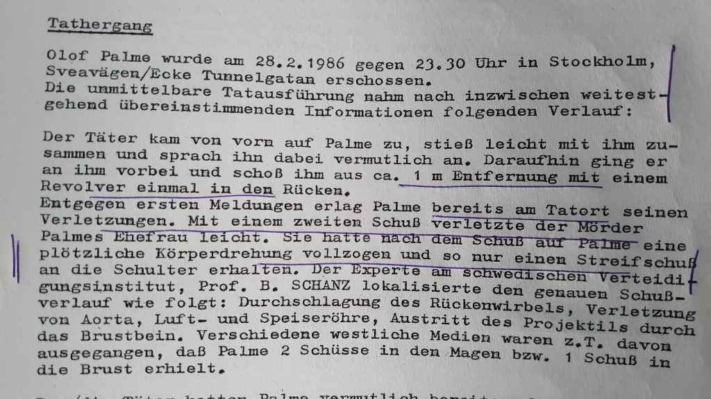 „Palmes Engagement für einen Nord-Süd-Dialog zwischen Entwicklungs- und Industrieländern, Schlichtungsbemühungen in internationalen Krisengebieten (z.B. Vermittlerrolle im Iran-Irak-Krieg), sein Eintreten für Nicaragua und Libyen sowie sein Einsatz für internationale Sanktionen gegen das Apartheid-Regime in Südafrika bildeten weitere Faktoren, für eine Gefährdung der persönlichen Sicherheit Palmes. Gegenwärtig werden operative Hinweise geprüft, die auf eine mögliche Beteiligung des israelischen Geheimdienstes ‚Mossad‘ bzw. ehemaliger Agenten des aufgelösten iranischen Geheimdienstes ‚SAVAK‘ am Mordanschlag gegen Palme hindeuten. In diesem Zusammenhang sind mögliche Querverbindungen zum südafrikanischen Geheimdienst ‚BOSS‘ zu beachten. Resultierend aus persönlichen Aktivitäten Palmes gegen das Apartheid-Regime der RSA (Eintreten für internationale Sanktionen; Palmes mögliche Wahl zum neuen UNO-Generalsekretär) und zur Unterstützung der südafrikanischen Befreiungsorganisation ‚ANC‘ und andere Gegner des Apartheid-Regimes sind bekannt).“