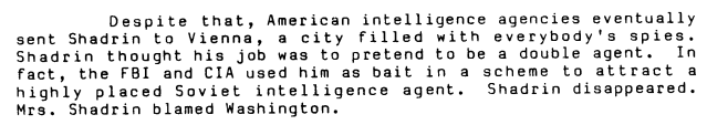 Abgespielt hatte sich das Drama folgendermaßen: Anfang Dezember 1975 wurden plötzlich die 15 Mitarbeiter der CIA-Station Wien in Alarmbereitschaft versetzt. Alle Dienstfreistellungen und Urlaube vor Weihnachten wurden widerrufen. Ein hochbrisante Einsatz stand bevor: Unter Aufsicht seiner CIA-Führungsoffizierin sollte der sowjetische Überläufer Shadrin seine Kontaktleute beim KGB treffen.