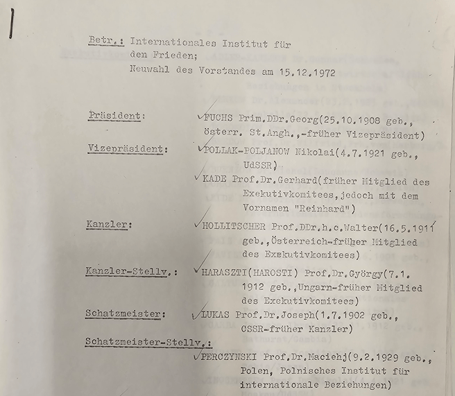 Ein weiteres Dokument von 1973 zeigt, dass anlässlich der Neuwahl des IIP-Vorstands der biografische Hintergrund der Mitglieder nachrichtendienstlich durchleuchtet wurde. Wiederum aus Westdeutschland erhielt die Staatspolizei einige Erkenntnisse – etwa zu dem argentinischen Journalisten Alfredo Valero. Dieser sei „1963 von der sowjetischen Regierung als ‚Beständiger und Selbstloser Kämpfer für den Frieden‘ erwähnt und mit einem der Lenin – Friedenpreise ausgezeichnet“ worden.